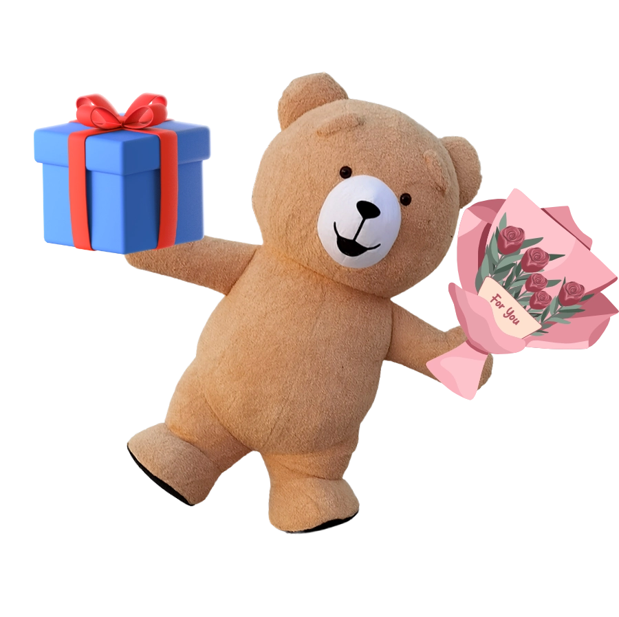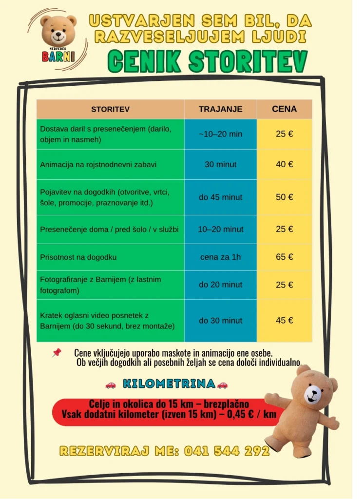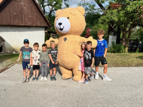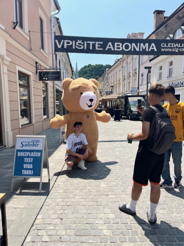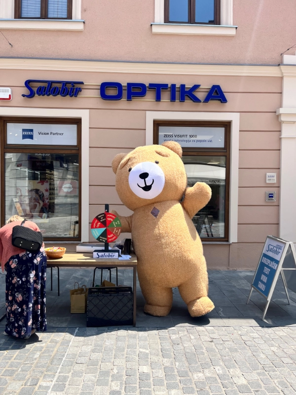 Medvedek privablja mimoidoče, nosi oglasno tablo, se slika z obiskovalci, oglašuje izdelek ali storitev.