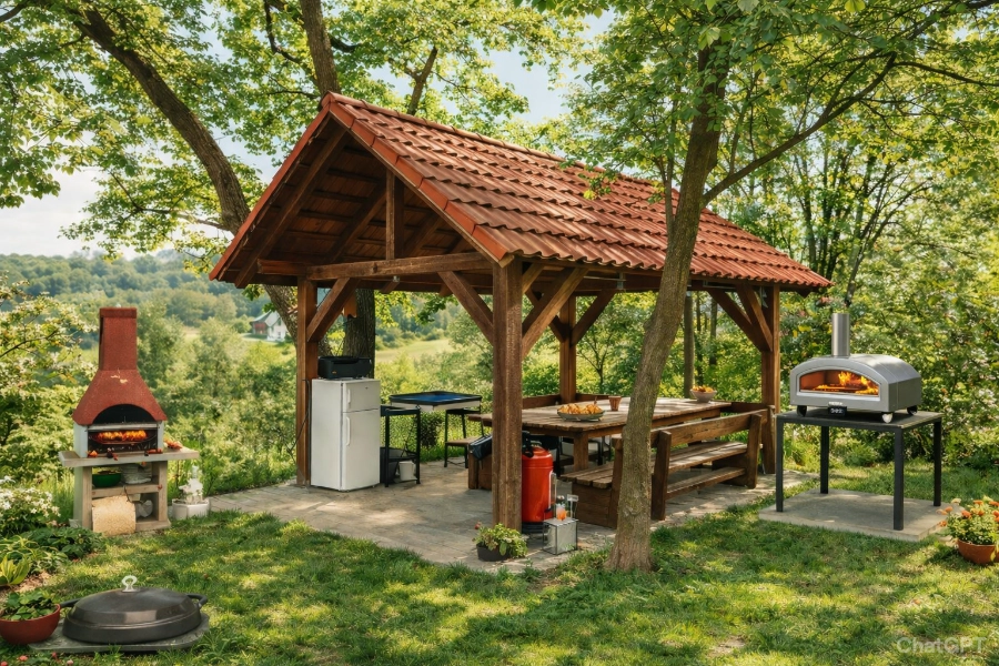 Pod nadstreškom so mize in klopi za do 16 oseb, z možnostjo razširitve prostora do 20 oseb. Prostor je funkcionalno opremljen za udobno pripravo hrane in prijetno druženje v vseh letnih časih.
